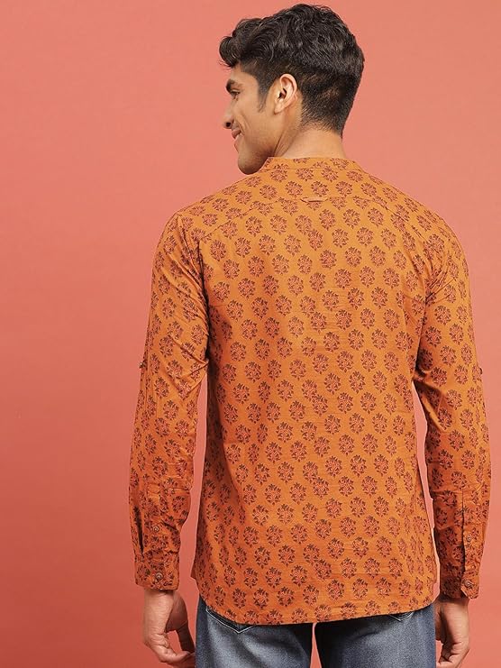DEELMO Men’s Cotton Blend Printed Long Sleeve Short Kurta | Stylish Casual & Ethnic Wear | Comfortable Mandarin Collar Kurta for Daily, Festive & Party Outfits