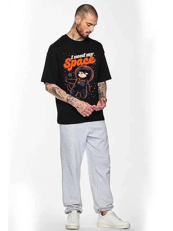 LEOTUDE Half Sleeve Oversized Cottonblend Round Neck Drop Shoulder Printed Men’s T-Shirt (Color Black)